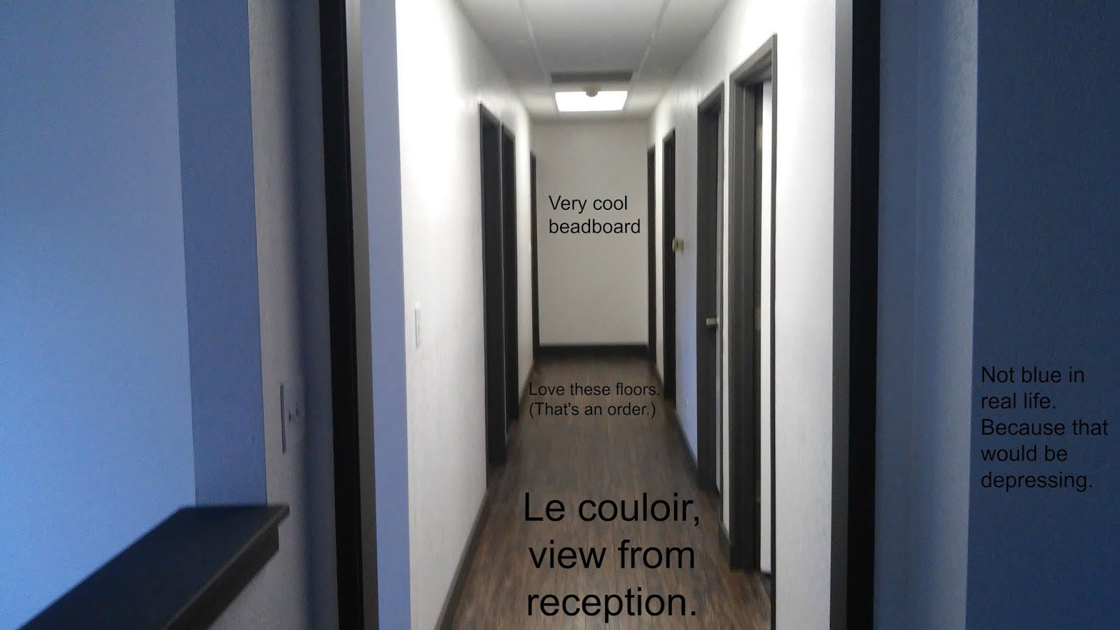 To your right (confused, yet? Because if you're viewing this tour in a full-screen browser, it's to your left) there's a hallway. A loooong hallway. With many doors.