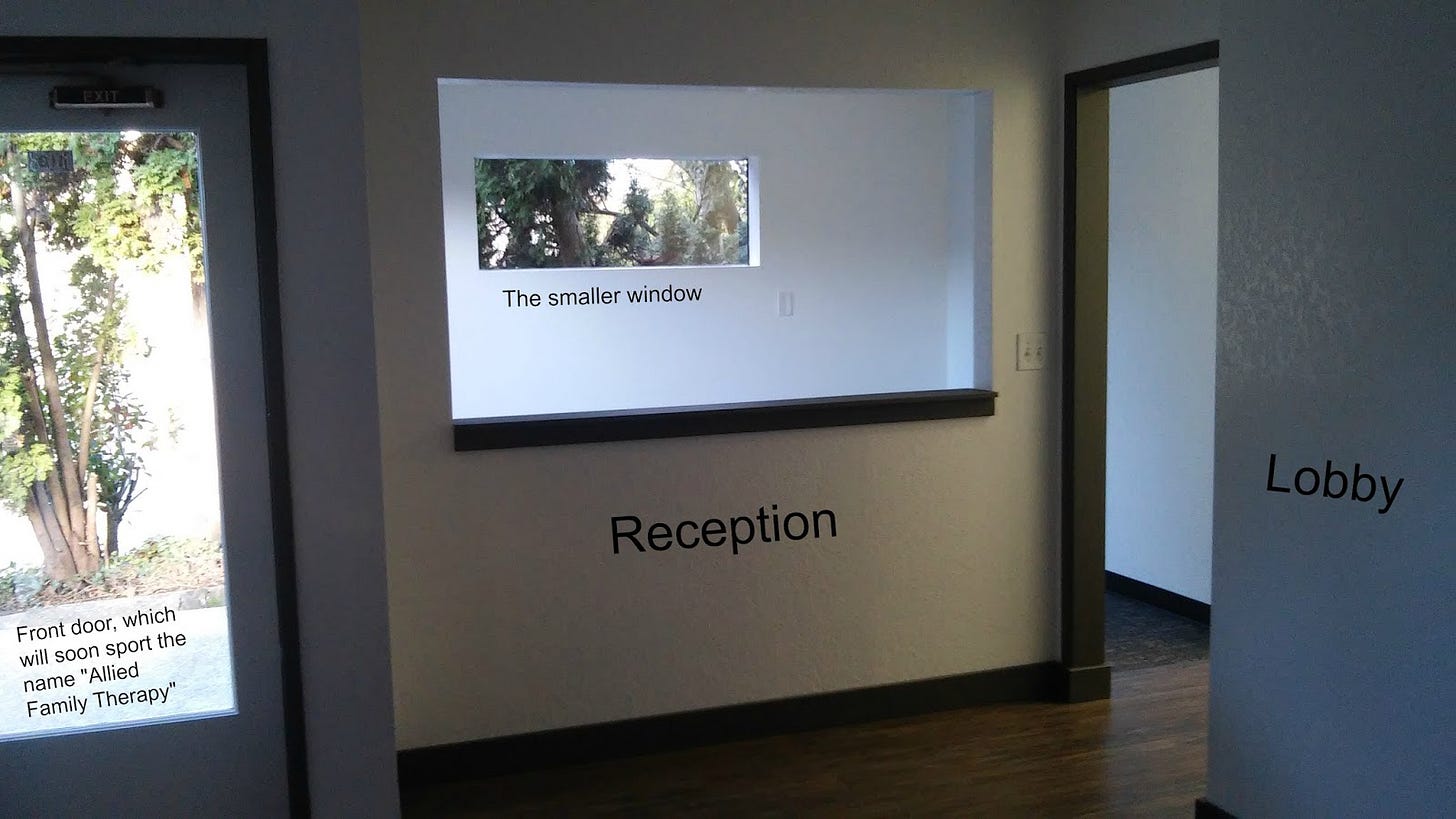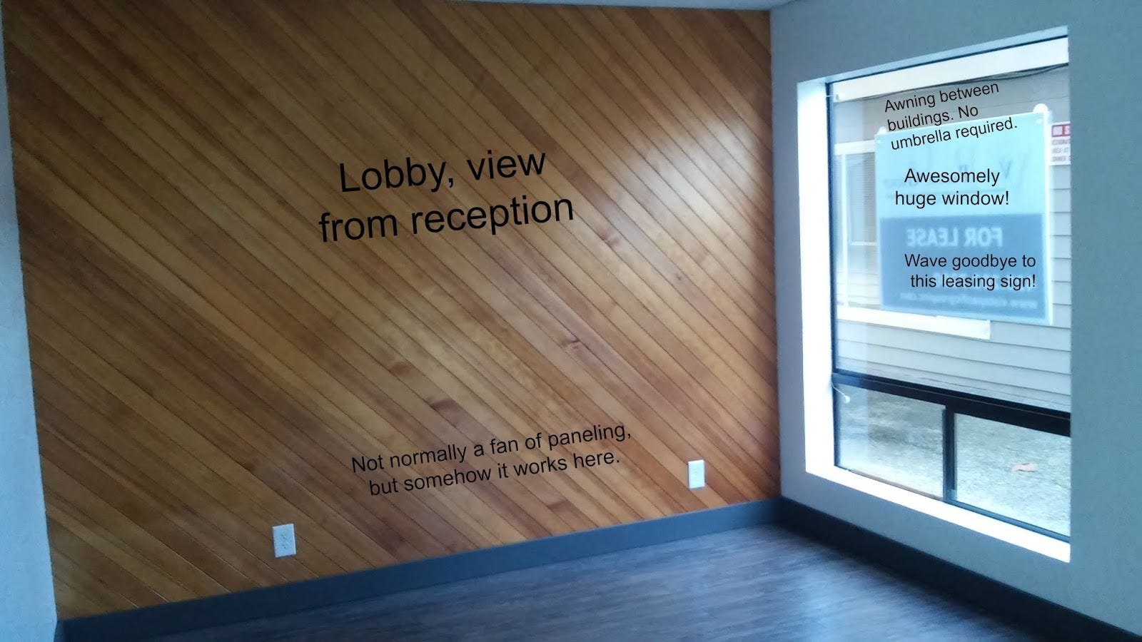 You turn to your left. And there, in all its glory: The reception area. Sure, it's stark raving naked. Today. But some day there'll be...a desk. And maybe a printer. And maybe...a receptionist.